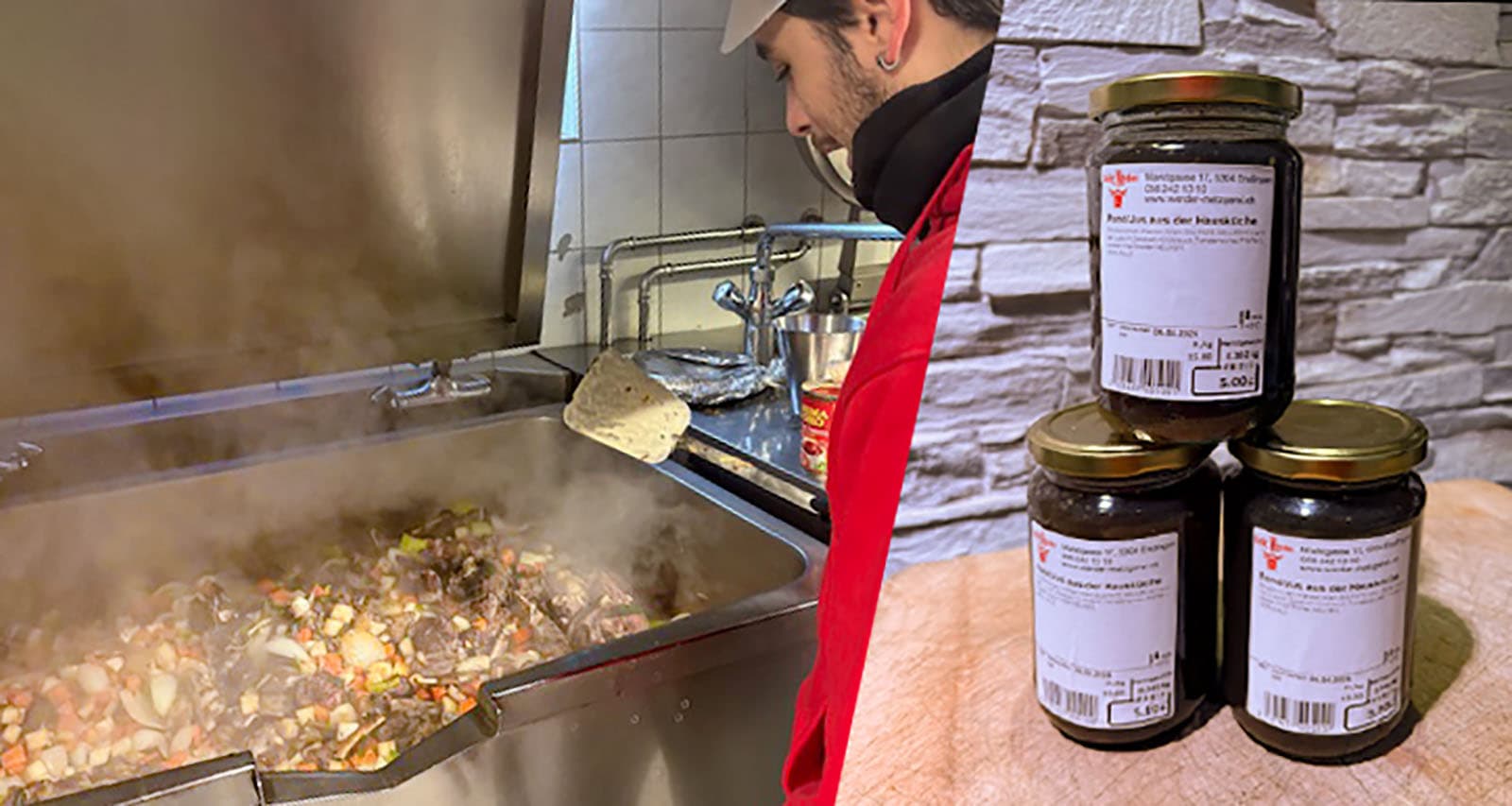 Aus 40 kg Rindsknochen, 20 kg Gemüse, 8 l Rotwein, Gewürzen & Wasser wurden viele Gläser voller kräftigem Fond – jetzt erhältlich in unserer Metzg.